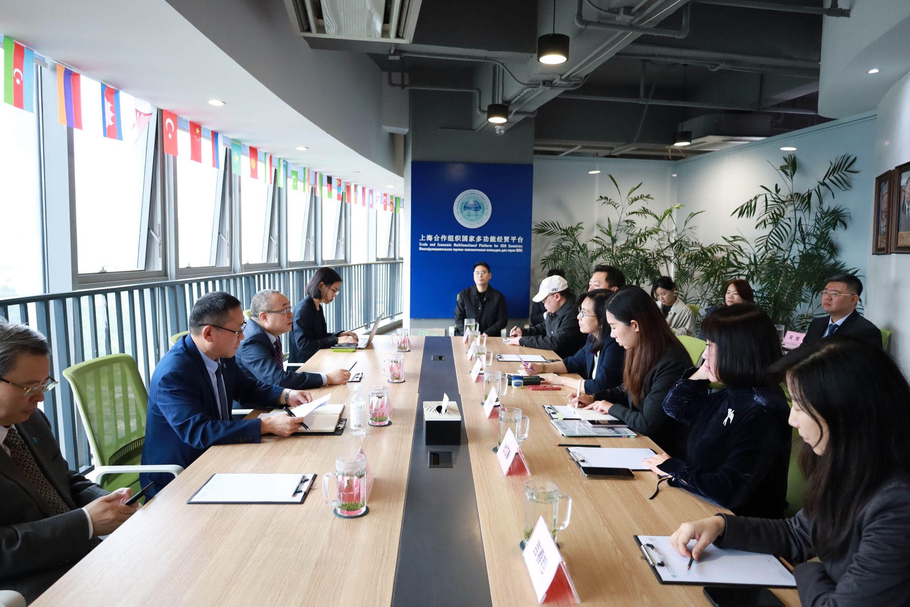 上海合作组织国家多功能经贸平台总干事、重庆市政协港澳台侨和外事委员会副主任胡开强欢迎王泺一行,刘杰副秘书长陪同会见。