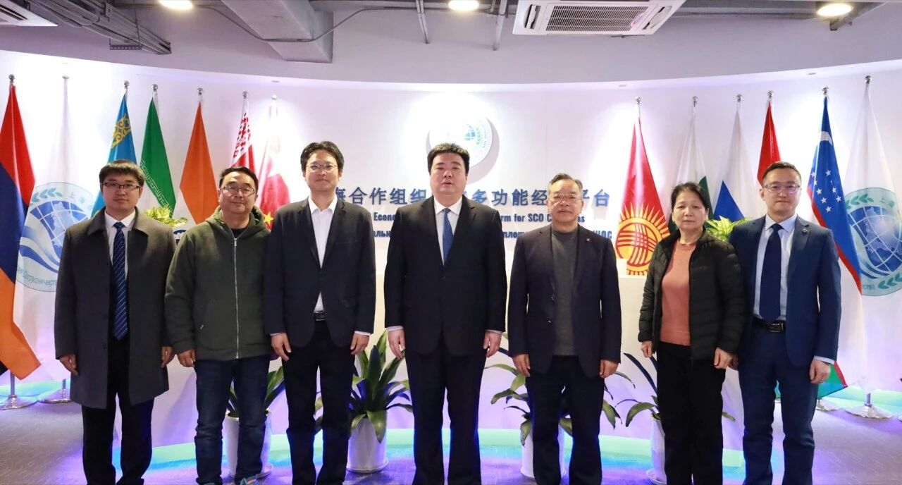 上海合作组织国家多功能经贸平台总干事、重庆市政协港澳台侨和外事委员会副主任胡开强欢迎段渝一行,王健平副秘书长陪同会见。