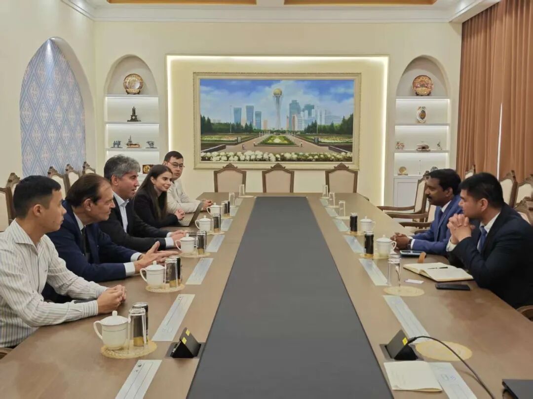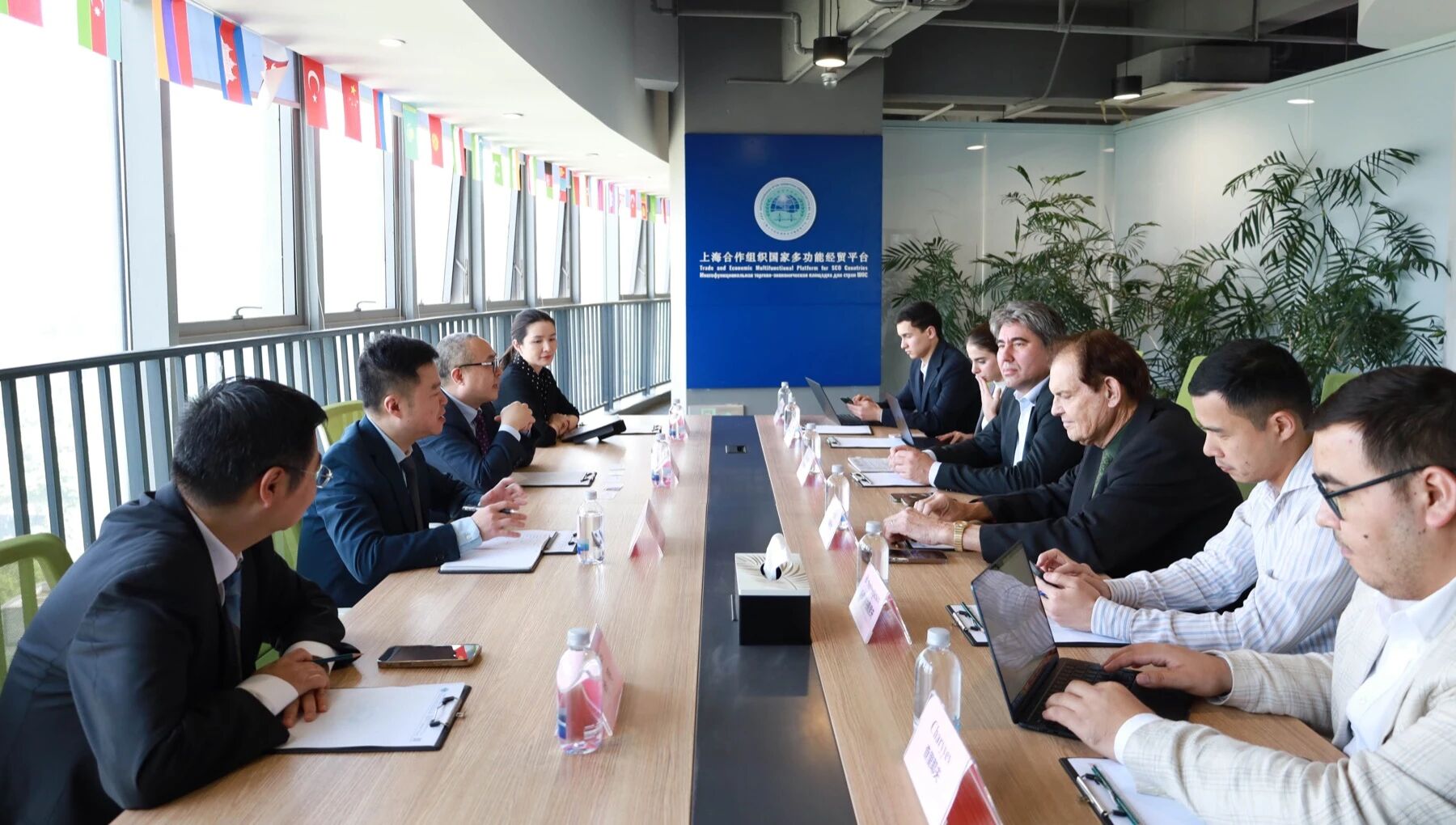 2026年4月23日,上海合作组织国家多功能经贸平台总干事、重庆市政协港澳台侨和外事委员会副主任胡开强会见泛里海协会主席穆拉特·谢伊特涅佩索夫一行,平台秘书长文继旭陪同会见。