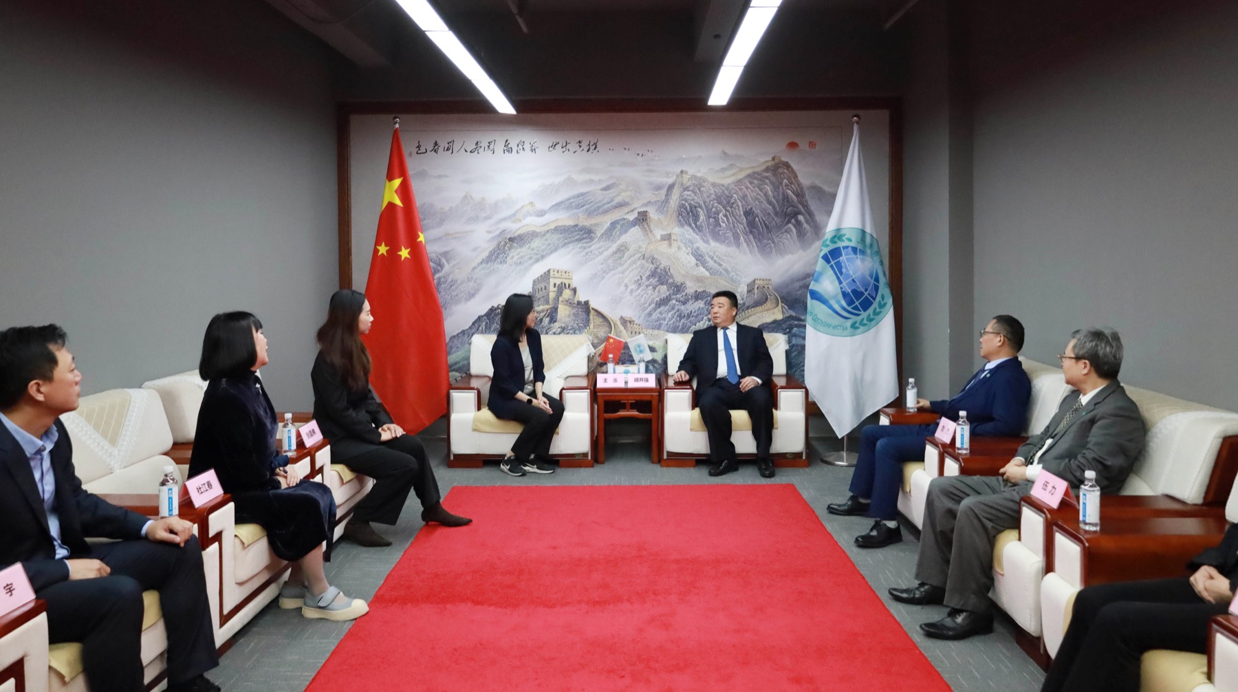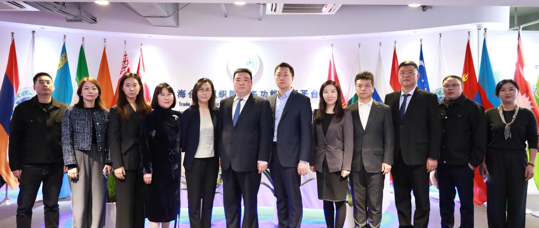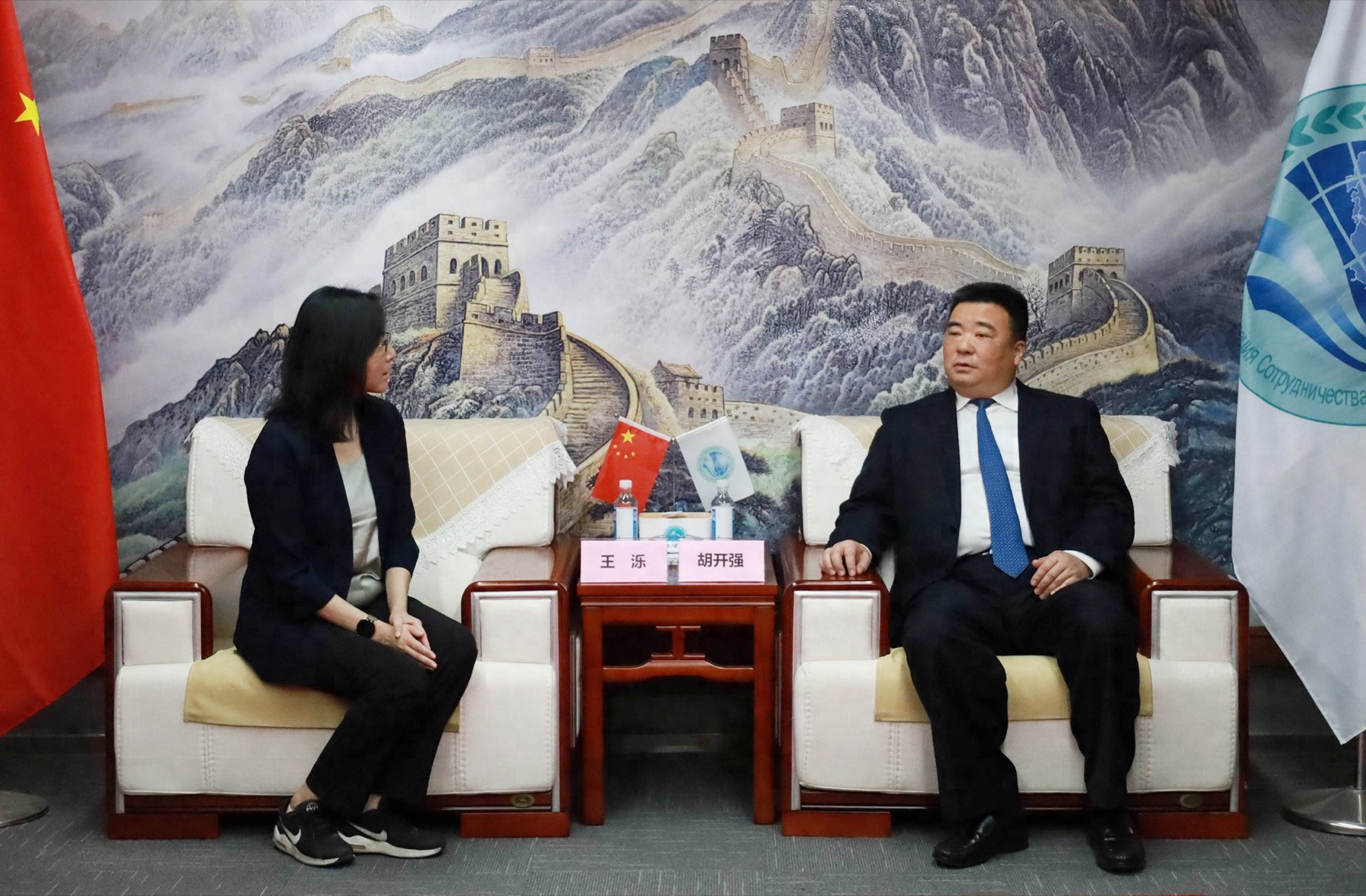 上海合作组织国家多功能经贸平台总干事、重庆市政协港澳台侨和外事委员会副主任胡开强欢迎王泺一行,刘杰副秘书长陪同会见。