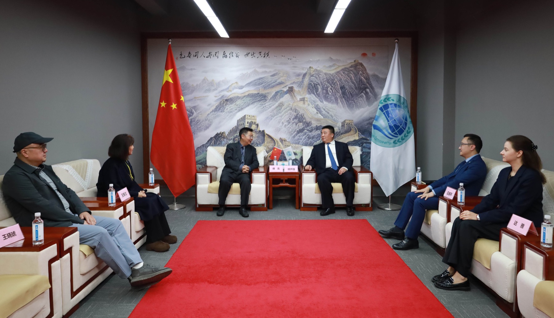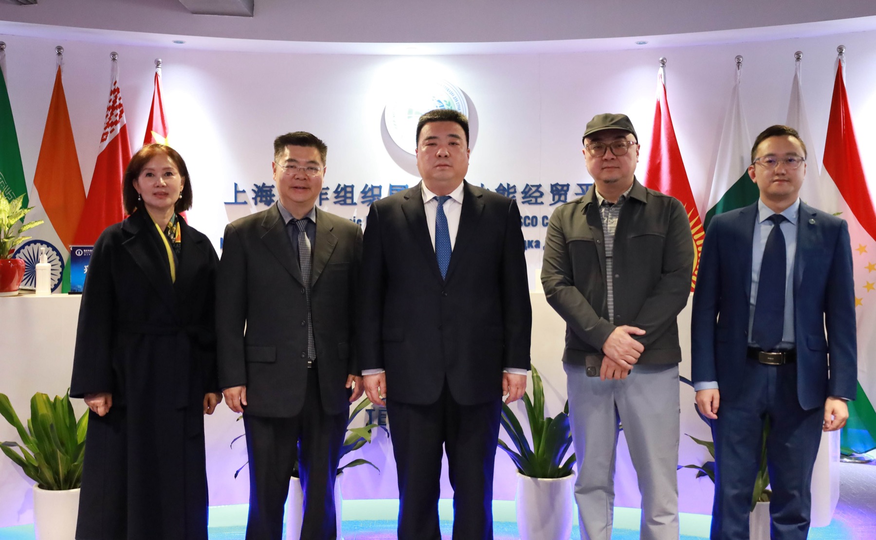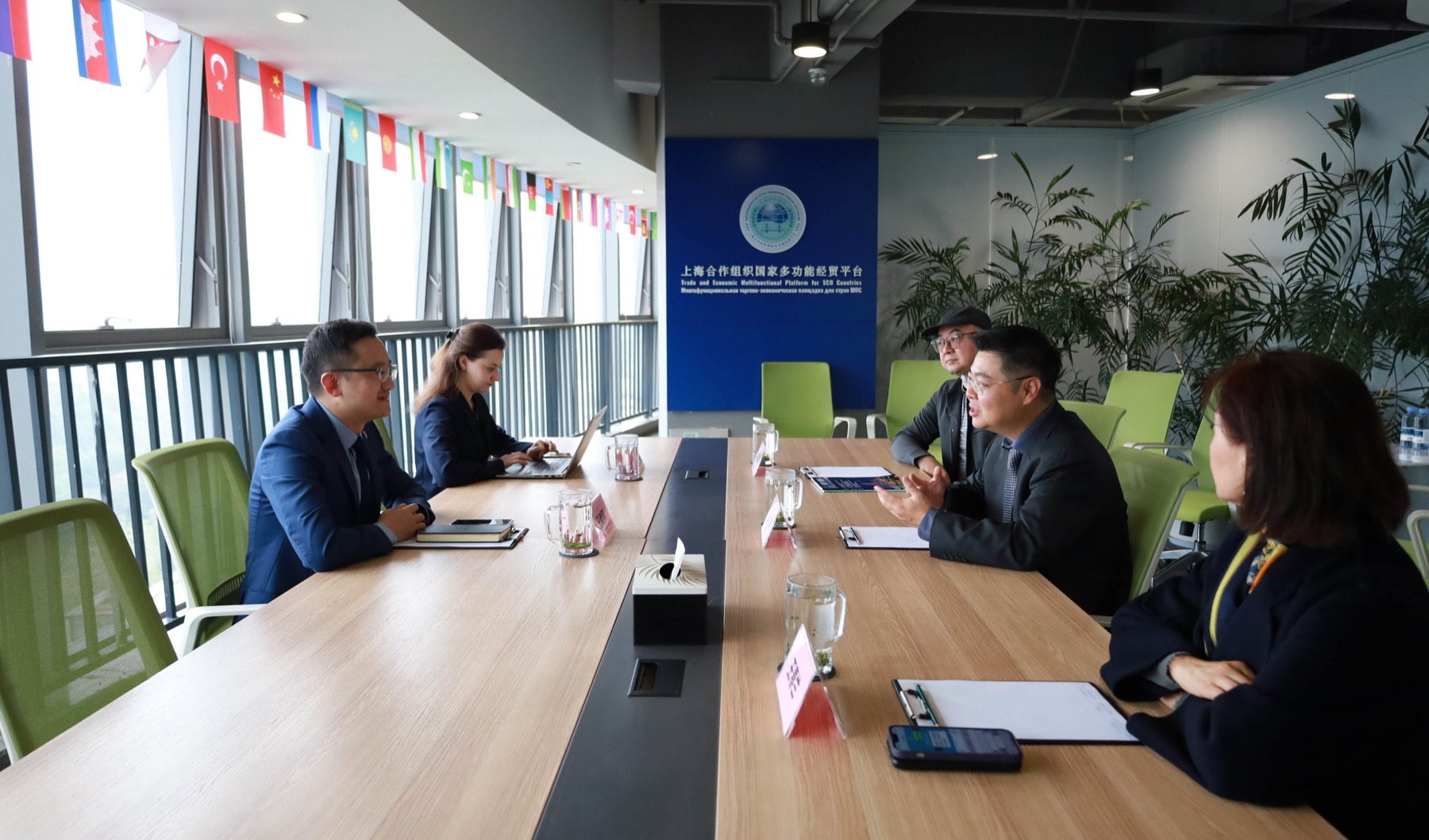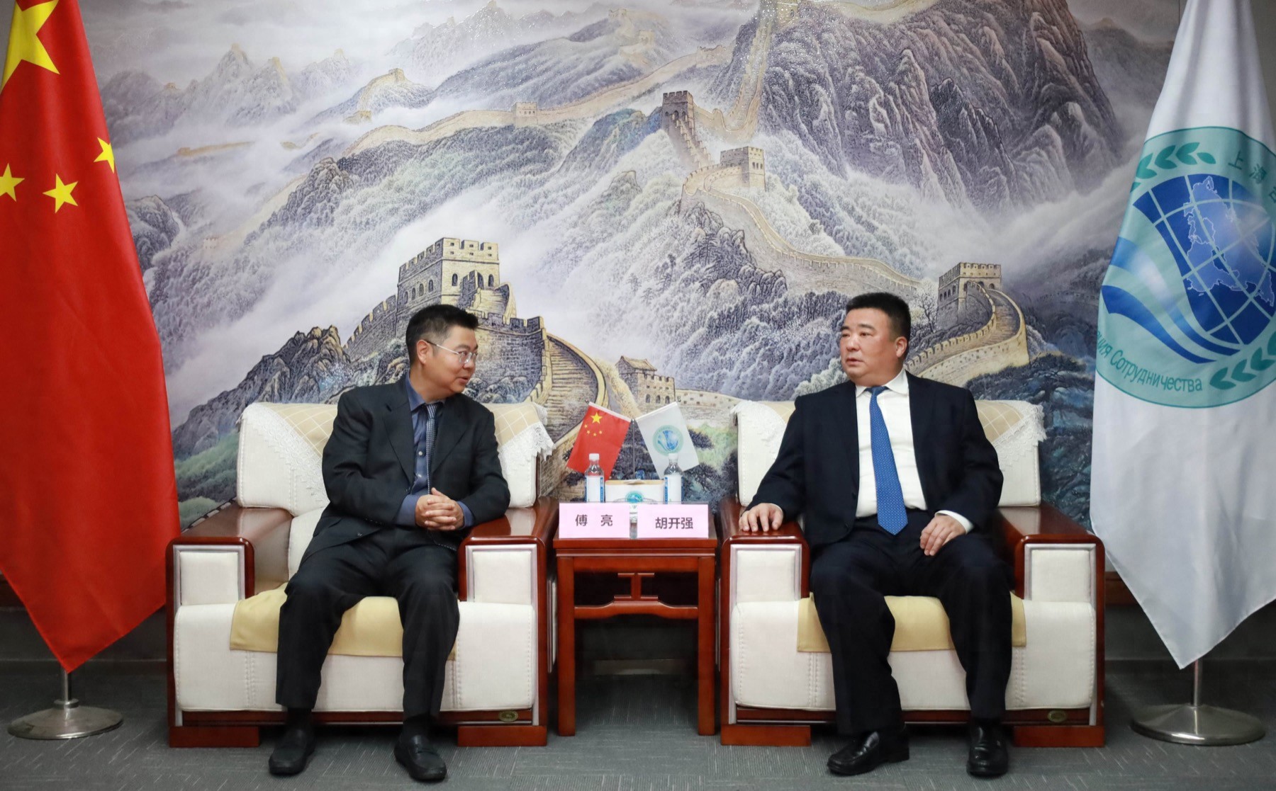 上海合作组织国家多功能经贸平台总干事、重庆市政协港澳台侨和外事委员会副主任胡开强欢迎傅亮一行,王健平副秘书长陪同会见。