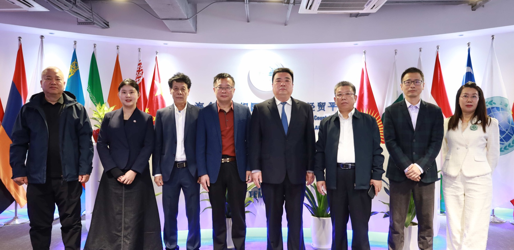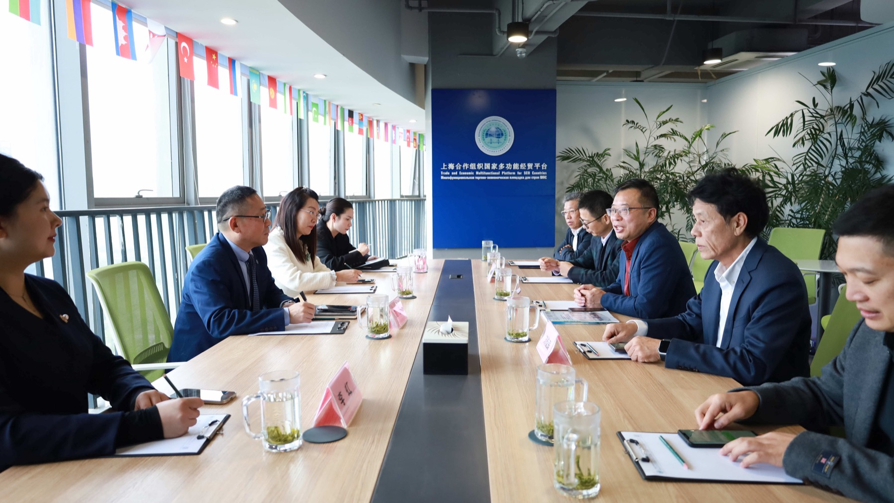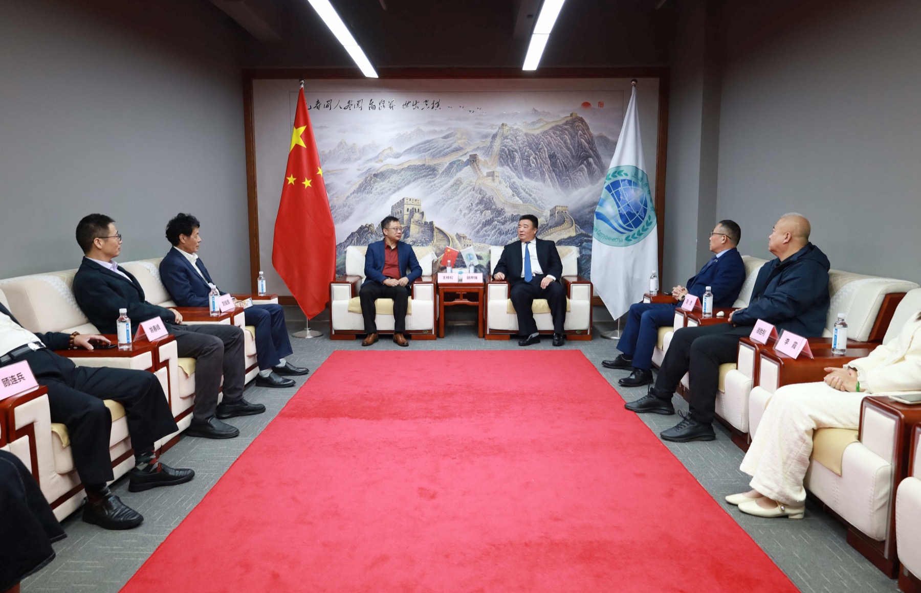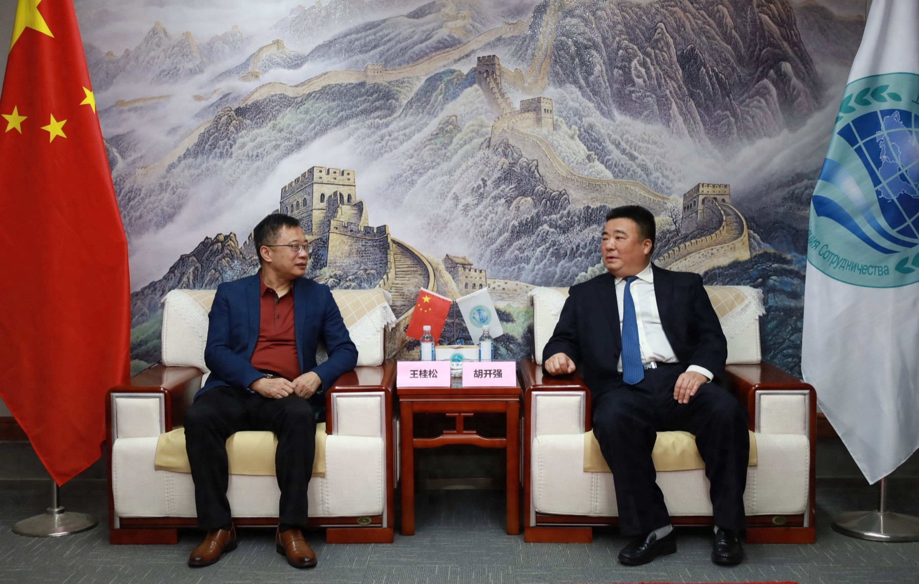 上海合作组织国家多功能经贸平台总干事、重庆市政协港澳台侨和外事委员会副主任胡开强欢迎王桂松一行,刘杰副秘书长陪同会见。