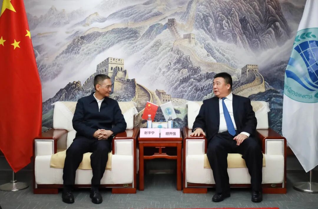上海合作组织国家多功能经贸平台总干事、重庆市政协港澳台侨和外事委员会副主任胡开强欢迎赵宇宁一行,张光福副秘书长陪同会见。