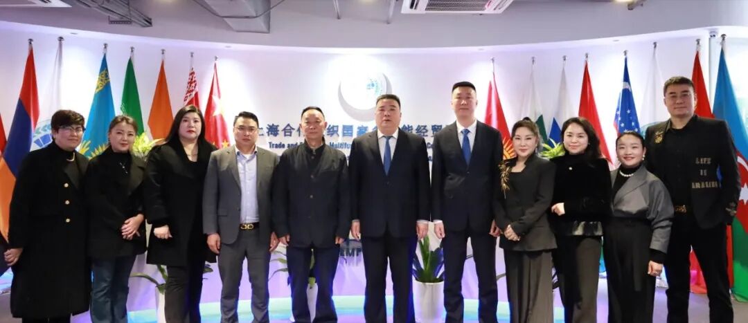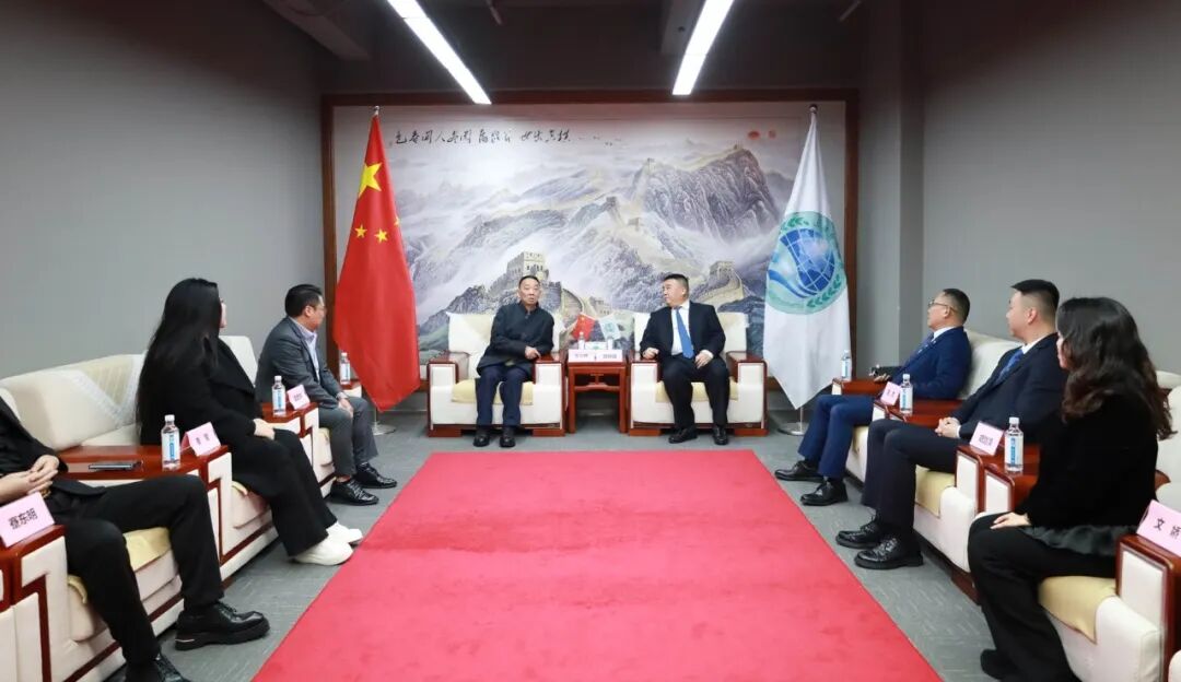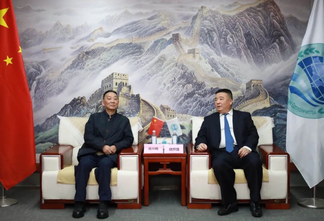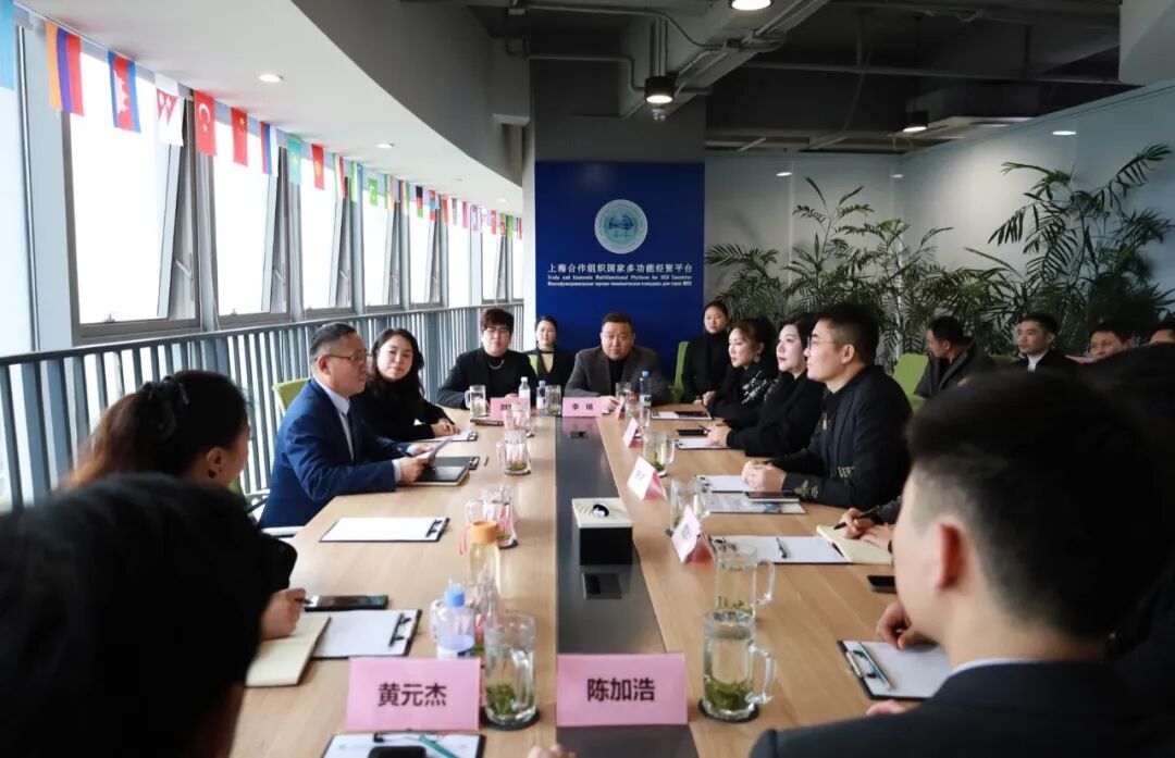 上海合作组织国家多功能经贸平台总干事、重庆市政协港澳台侨和外事委员会副主任胡开强欢迎高兴明一行,刘杰副秘书长陪同会见。