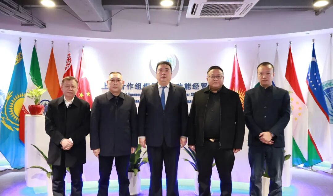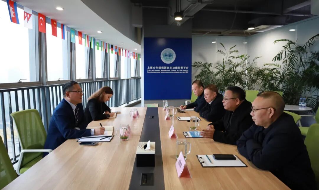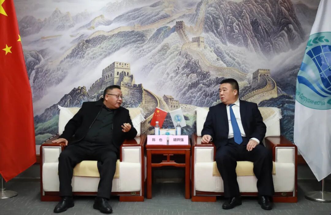 上海合作组织国家多功能经贸平台总干事、重庆市政协港澳台侨和外事委员会副主任胡开强欢迎陈也一行,刘杰副秘书长陪同会见。