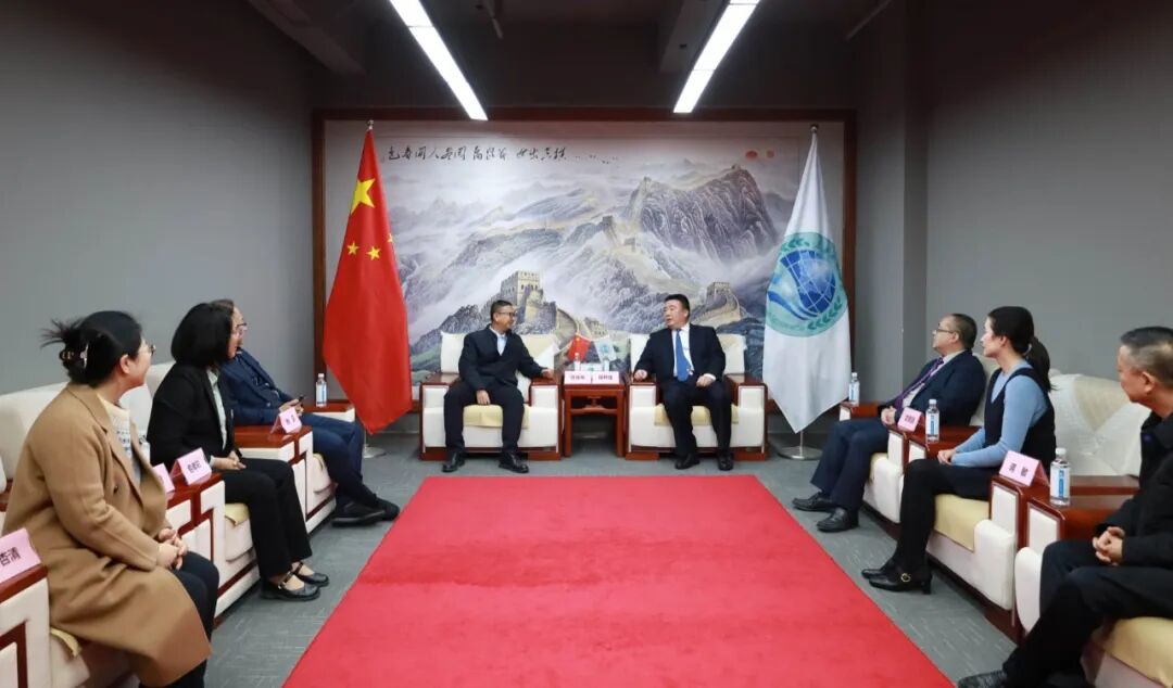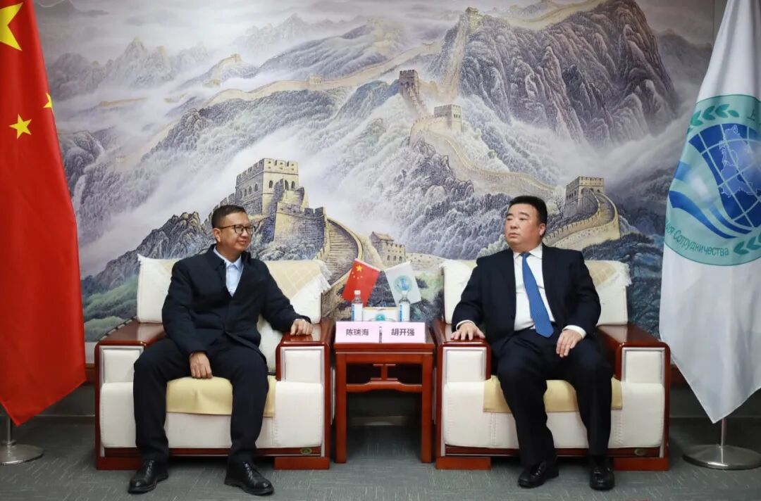 上海合作组织国家多功能经贸平台总干事、重庆市政协港澳台侨和外事委员会副主任胡开强欢迎陈瑞海一行,文继旭秘书长陪同会见。