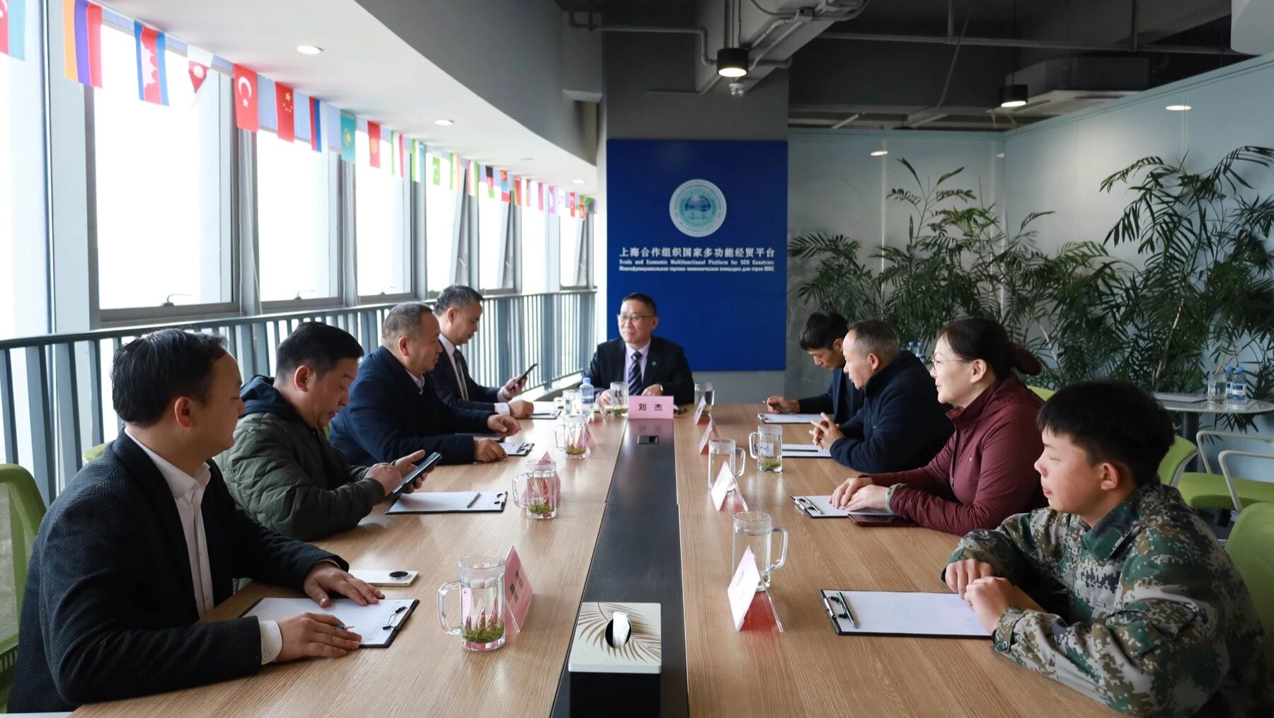 刘杰副秘书长代表上海合作组织国家多功能经贸平台总干事、重庆市政协港澳台侨和外事委员会副主任胡开强欢迎李灿一行。