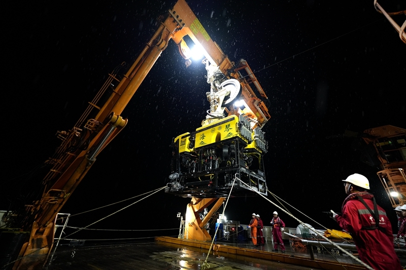 “海琴”号由上海交通大学水下工程研究所自主研制,是为“中山大学”号海洋综合科考实习船量身定制的新型高效深海电动ROV系统,搭载了高清摄像机、多功能机械手、探测传感器等科考设备,具备自动定向、悬停定位、自动巡线等智能作业能力。