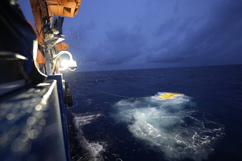 8月22日晚,考察队员在“中山大学”号船艉主甲板冒雨布放“海琴”号。